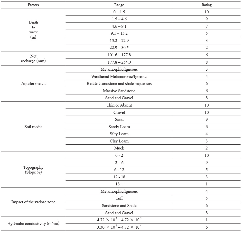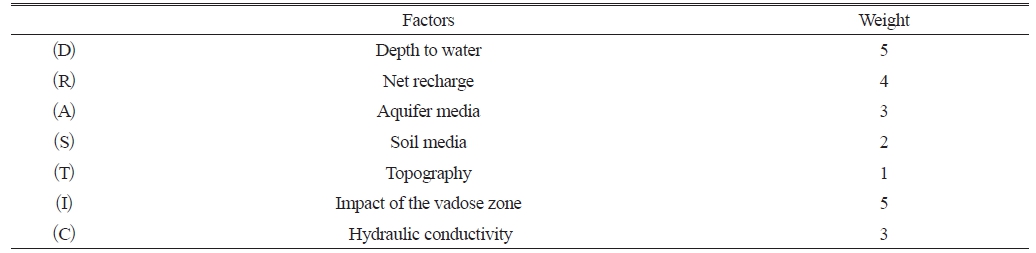 지하수 심도는 지표면에서부터 지하수면까지의 거리를 의미하며, 지하수 심도가 감소할수록 오염물질이 쉽게 지하수면에 도달할 가능성이 크다(Patel et al., 2022). 지하수 심도 데이터는 현장에서 얻은 69개의 지하수 심도 데이터를 이용하였으며 데이터가 없는 지역에 대해 공간적으로 보간하기 위해 역거리 가중법(inverse distance weighted, IDW)를 사용하였다. 이 방법은 먼 지점보다 가까운 지점의 영향을 더 많이 받으며 지하수의 공간적 분포를 보간하는데 주로 사용되며(Kwon et al., 2022; Adhikary and Dash, 2017; Yang et al., 2020) 대상 지역과의 거리에 따라 가중치를 부여하여 예측값을 생성하므로 비교적 정확한 예측이 가능하다는 장점이 있다(Park et al., 2017). 지하수 함양량은 지표면에서 지하수에 도달하는 물의 양을 나타내며 함양량이 클수록 지하수면이 상승하여 오염 가능성이 커진다고 평가할 수 있다(Shirazi et al., 2013). 지하수 함양량은 해당 지역의 면적(A)에 대한 평균 함양률(RR)과 강수량(P)을 곱하여 계산할 수 있으므로(Kim et al., 2020), 밀양시 평균 함양률(14.4%)(MOE, 2023)과 밀양시 인근 종관기상관측소(ASOS) 1개소 및 방재기상관측소(AWS) 11개소에서 획득된 강수량을 바탕으로 계산하였다. 특히, 강수량은 2014년부터 2023년까지 10년간 연평균 강수량 데이터를 이용하였으며(KMA, 2024), 관측소 데이터의 공간적 분포를 파악하기 위해 IDW를 이용하여 보간하였다. 대수층 매질은 연구지역의 대수층의 특성이나 종류를 나타내는 인자로, 미고결 암석(모래, 자갈)이거나 매질의 입자 및 투수성이 클수록 오염 가능성이 커진다고 평가할 수 있다(Patel et al., 2022). 대수층 매질은 수문지질도 자료를 활용한 Aquifer media (Envbigdata, 2020a)를 이용하였다. 토양 매질은 Aller et al.(1987)에 의해 토양의 종류, 입자 크기 등에 따라 오염 취약성이 결정되며, 점토 함량이 적고 입자 크기가 클수록 오염 가능성이 크다고 보고된다. 따라서 1:25000 토양도로부터 심토토성 정보를 활용한 Soil media (Envbigdata, 2020b)를 이용하였다. 지형 경사가 오염취약성에서 의미하는 바는 경사가 낮을수록 함양량이 증가하여 오염물질이 대수층으로 투과될 가능성이 증가한다고 할 수 있다(Yeh et al., 2009). 지형 경사는 1:25,000 수치지형도(NGII, 2024)를 이용한 수치표고모델(digital elevation model, DEM)로부터 경사도(%)를 계산하였다. 불포화대는 대수층과 토양 사이의 영역으로 대수층 매질 및 토양 매질과 마찬가지로 매질의 투수성이 클수록 오염이 지하로 침투할 수 있으므로 오염취약성은 증가한다. 불포화대는 시추 조사를 통해 파악해야 하지만 본 연구에서는 관련 자료의 부족으로 불포화대는 지질 특성이 가장 큰 영향을 준다고 판단되어 1:50,000 지질도 자료를 이용하여 분류하였다. 우리나라는 토양층이 비교적 얇게 분포하기 때문에 지질도를 이용하여 불포화대 매질을 분류한 사례가 있다(Cheong et al., 2008; Ki et al., 2013). 수리전도도는 대수층 매질 내에서 물 흐름의 용이한 정도를 의미하며, 수리전도도 값이 클수록 오염물질이 쉽게 이동하기 때문에 오염 가능성이 크다(Neshat et al., 2014). 수리전도도는 지질 특성에 따라 구분하여 암반대수층의 수리전도도는 4.72×10-5 m/sec(MLIT et al., 2003), 충적층의 수리전도도는 4.00×10-4 m/sec를 적용하였다(Won et al., 2016).