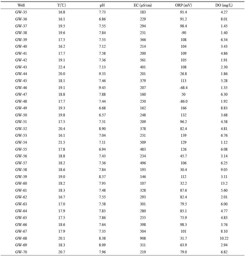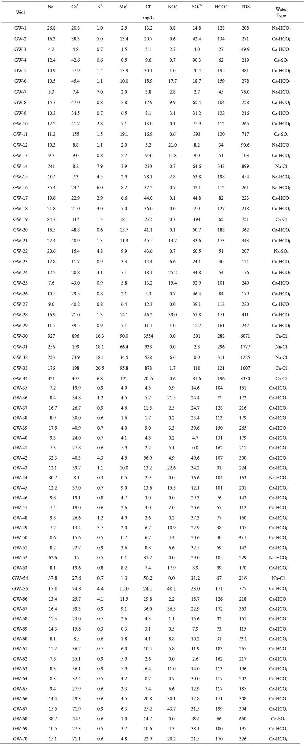 2023년도 연구지역의 지하수 수질 특성을 분석하기 위해 채수 여건, 관정 관리 상태, 사용 여부 및 관정 분포를 고려하여 36개의 지하수 관정과 보조지하수관측망 34개소, 총 70개의 관정을 선정하였다. 현장 수질 측정 시 관정 내 지하수를 충분히 양수하여 잔류 지하수를 충분히 양수한 후 YSI사의 다항목수질측정기(YSI ProQuatro)를 이용하여 수온, pH, 전기전도도(electrical conductivity, EC), 산화환원전위(oxidation reduction potential, ORP), 용존산소(dissolved oxygen, DO)를 측정하였다. 주요 양·음이온 분석자료는 밀양시 지하수관리계획을 통해 수집된 자료로 유도결합플라즈마(ICP-OES, Thermo ScientificTM, iCAPTM PRO)와 이온크로마토그래프(IC, Thermo Scientific, DionexTM, AquionTM)를 이용하여 분석하였다.