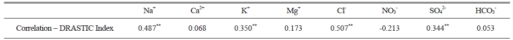 DRASTIC 모델을 평가하기 위해 각 관정에 대한 DRASITC 지수와 수질 데이터의 상관관계를 분석하였다. 상관관계 분석은 Spearman 상관분석을 사용하였다. DRASTIC 지수와 Cl-의 상관계수가 0.507(p<0.01에서 유의함)로 이온 중에서 가장 높은 상관성을 보였다(Table 7). 이는 Cl-이 DRASTIC 모델과 강한 양의 상관관계를 갖는다는 것을 시사한다. Cl-은 흔히 사용되는 살충제 및 소독제에 사용되는 염소 화합물의 주요 성분이며, 산업 및 농업 활동 등 다양한 오염원으로 인해 발생 될 수 있다(Panno et al., 2006; Dugan et al., 2017). 또한 Cl- 농도가 증가하면 수질 및 생태계, 특히 작물 재배에 부정적인 영향을 미칠 수 있다(Panno et al., 2006). 일반적으로 질산성질소의 농도가 DRASTIC 지수와 더 강한 상관성을 갖는 것으로 알려져 있지만 Cl-도 지하수 오염 지표 중 중요한 인자로 특정 지역에서의 오염원의 특성과 지하수 유동 조건에 따라 DRASTIC 지수와 강한 상관관계를 나타낼 수 있다(Kaliraj et al., 2015; Srinivasamoorthy et al., 2011). 따라서 연구지역 내의 Cl-농도에 대한 지속적인 모니터링을 이용한 분석이 필요하다.