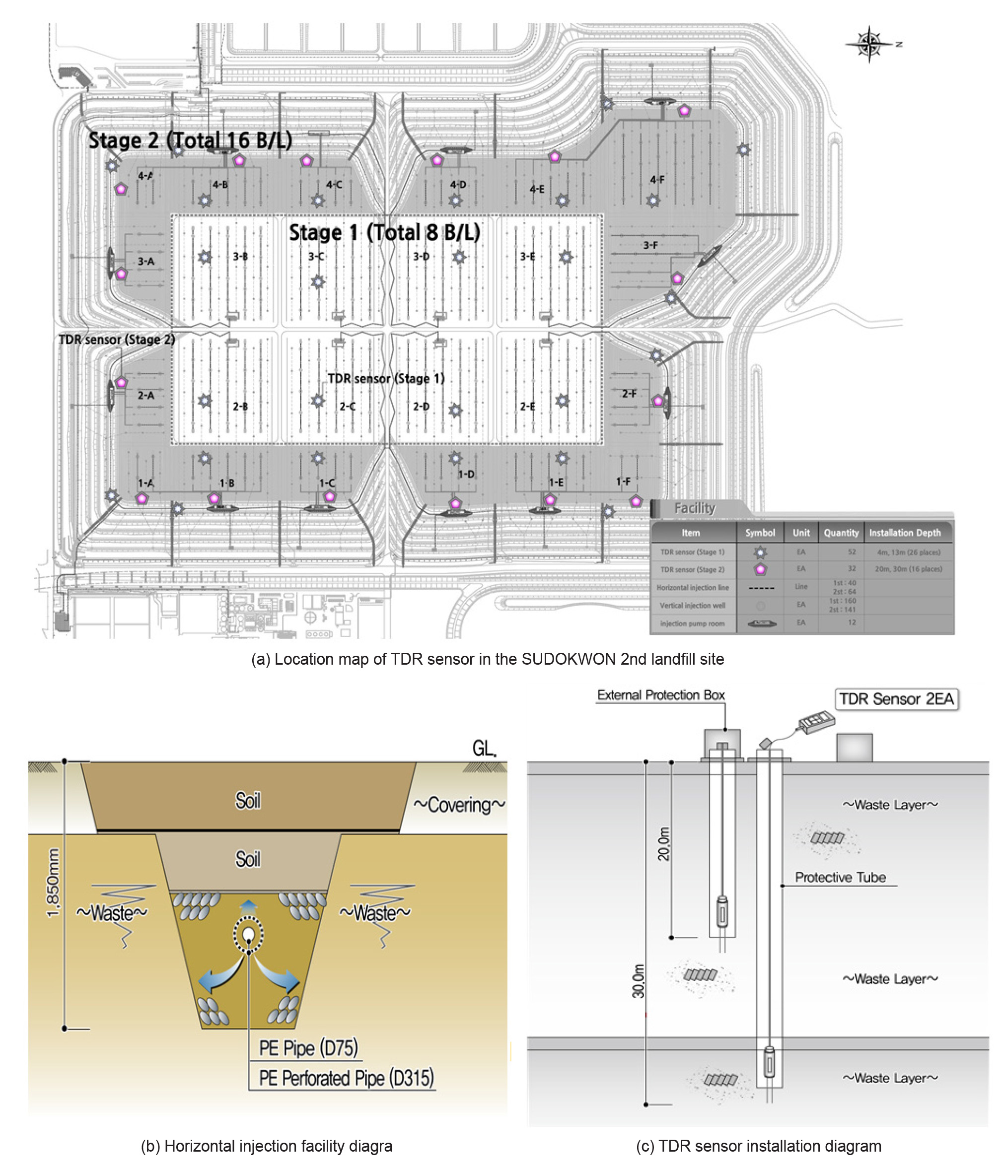 1단계 시설은 재순환수 주입 용량 3,200 m2/일 규모로 제2매립장 내측 8개 블록(주입면적 751 천 m2)에 설치되어 2020년 7월부터 운영을 시작하였다. 그리고 2023년 12월에는 외각 16개 블록을 대상으로 2단계(시설용량 2,600 m2/일, 주입면적 695천 m2) 시설의 설치가 완료되면서, 현재는 제2매립장 전체에 침출수매립시설 환원정화설비가 운영 중이다. 또한 제2매립장 내부 수분 변화 모니터링을 위한 TDR 센서는 Fig. 1a와 같이 총 84개소에 설치되어 있으며, 설치 깊이는 Fig. 1c와 같이 재순환된 침출수의 확산 및 분포 영향을 고려해 1단계 시설은 4 m, 13 m 깊이에 총 52개가 설치되어 있고, 2단계 시설은 20 m, 30 m 깊이에 총 32개가 신규로 설치되었다.