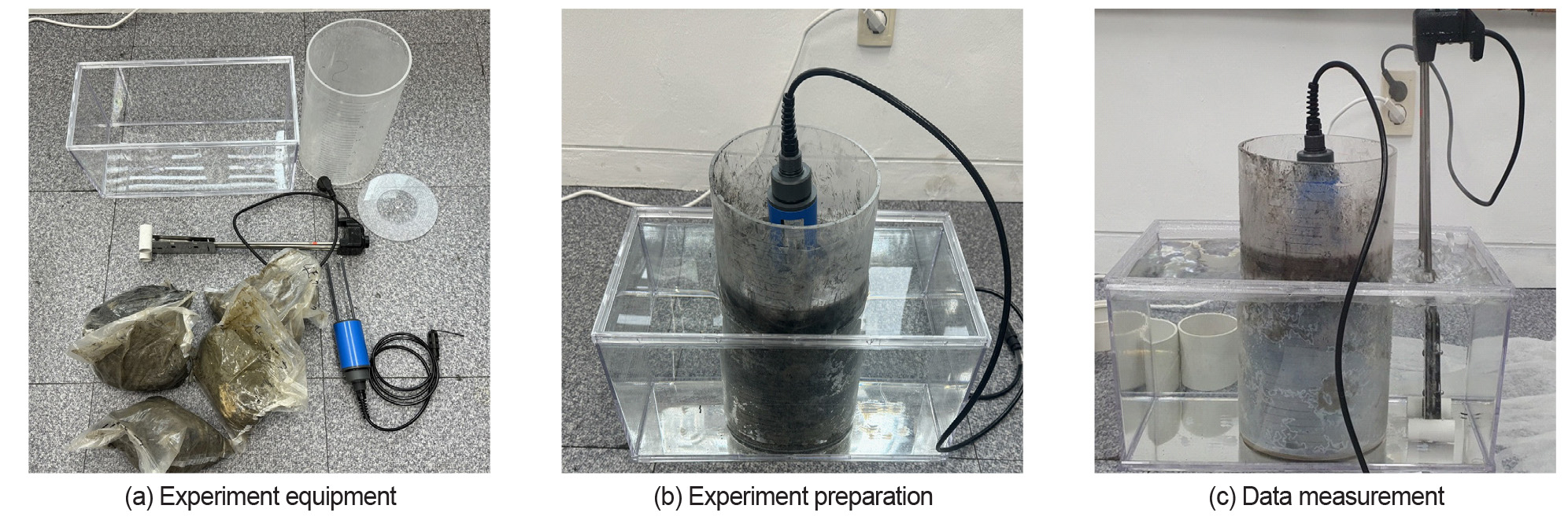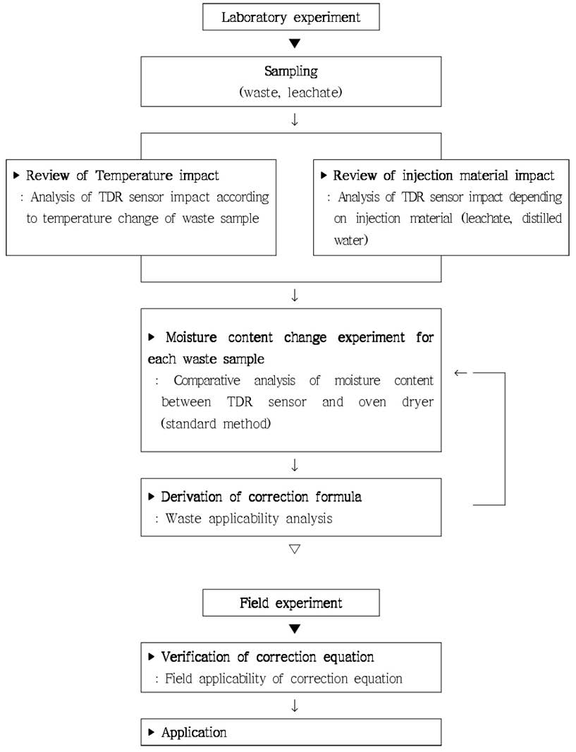 TDR 센서에서 측정되는 함수율이 일반적인 토양 환경과 매립지 환경에서 동일하게 측정이 되는지 비교하기 위하여 Fig. 3과 같이 온도, 주입 물질, 함수율을 변화시켜가며 실내 실험을 수행하였다. 이렇게 도출된 결과를 토대로 TDR 센서를 매립지에 설치해 현장 적용성을 평가하였다.