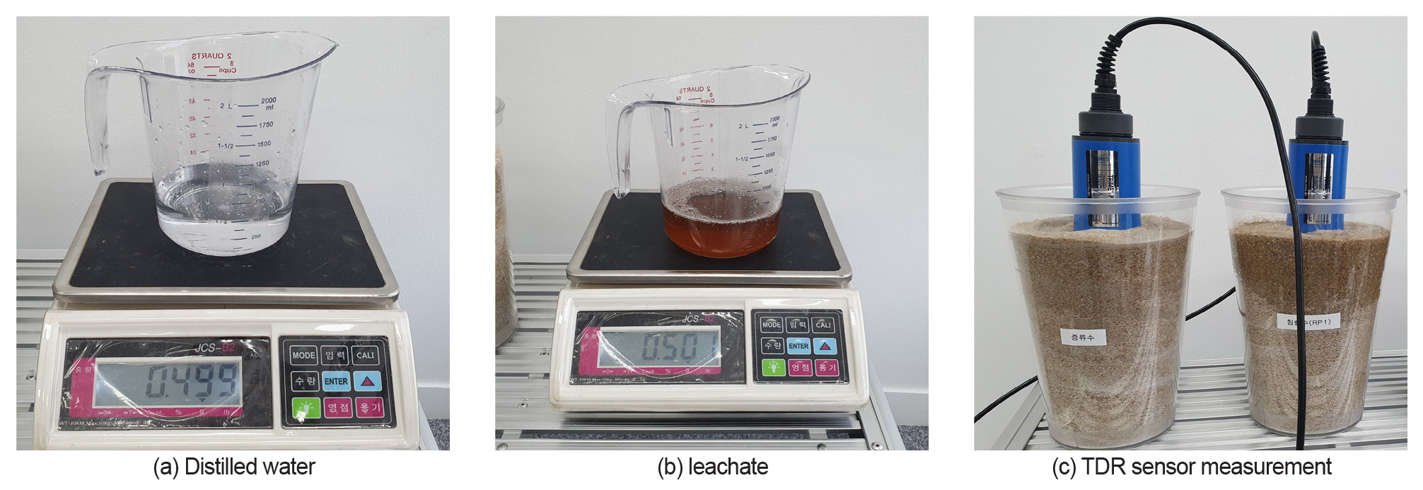 TDR 센서로 측정되는 함수율이 주입 물질에 의해 영향을 받는지 확인하기 위하여, 표준사를 동일 매질로 사용해서 증류수와 침출수를 각각 혼합하고 TDR 센서에 의해 측정되는 함수율을 비교하였다. 실험은 Fig. 5과 같이 실험 시작 전 표준사(7,200 g)를 준비하여 이를 5 L 크기의 아크릴 용기에 담았다. 이후 증류수와 침출수를 중량 기준으로 각각 500 g, 1,000 g을 계량하여 표준사와 혼합 후 TDR 센서를 설치하여 함수율을 측정하였다. 함수율 측정은 30분 간격으로 1시간 동안 측정하였다.
