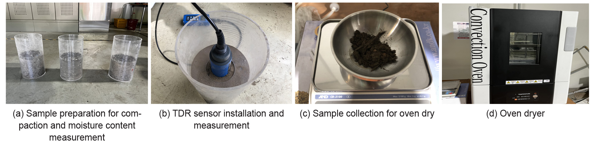 채취한 폐기물 시료는 폐기물 공정시험에 따라 Fig. 6d의 Oven dryer를 활용하여 110oC 온도에서 4시간 건조하여 함수율(Oven dry 함수율)을 별도로 측정하였고, 이를 통해 TDR 센서로 측정된 함수율과 Oven dry 함수율을 비교하였다.