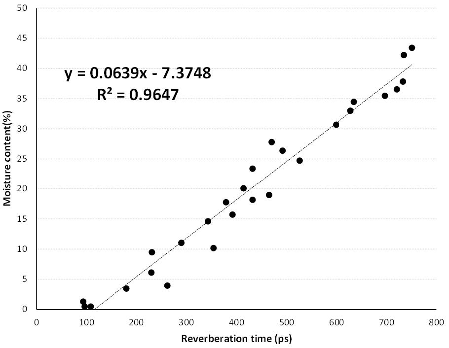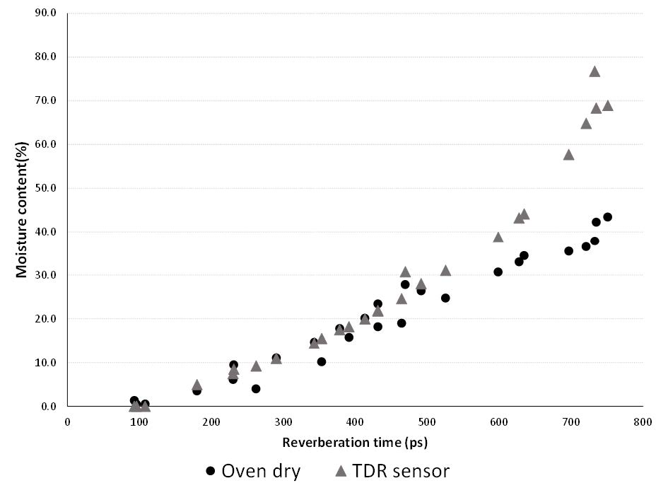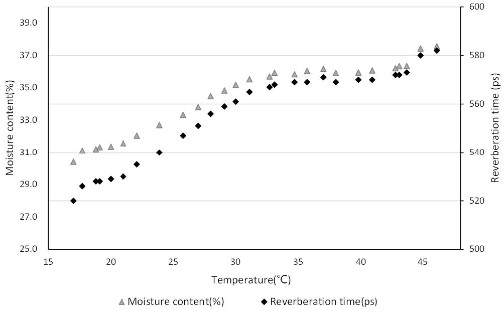Fig. 7 Measurement of moisture content and reverberation time by temperatures. |