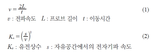 TDR 센서에서 측정되는 함수율은 다공성 매질 내 전자기파 이동시간과 유전상수(Ka) 사이의 관계에 기반한다. 전자기파 신호는 프로브의 끝부분에서 반사되어 계측기로 돌아오며, 계측기는 펄스를 보낸 시간부터 반사파를 수신하는 시간까지의 총 경과를 측정한다. 프로브의 길이(L)와 이동시간(t)을 알고 있다면, 전자기파의 전파속도(v)는 식 (1)로, 유전상수(Ka)는 (2)의 식으로 계산할 수 있다(Li and Li, 2011).