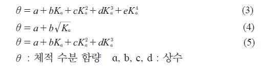 폐기물의 체적 수분 함량(θ)과 Ka간의 관계를 나타나는 다양한 경험적 상관관계가 개발되어 왔으며, 방향 변화를 허용하는 가장 일반적인 비선형 함수 유형은 n차 다항식으로 나타낼 수 있다. 가장 일반적인 식들은 (3), (4), (5)로 전파속도가 빠를수록 Ka가 감소하고, 함수율 또한 감소하게 된다(Li & Zeiss, 2001, Masbruch & Ferre, 2003).
