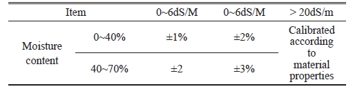 Table 1과 Fig. 2의 TRIME-PICO 64는 매질부에 접촉된 측정 프로브 하단부에서 온도를, 프로브에 설치된 탐침봉을 통해서 전기전도도와 반향 시간을 측정하는 기기로, 측정된 반향 시간은 보정식을 통해 함수율로 변환하여 표시하게 된다. 이때 보정식은 함수율을 측정하는 환경에 맞게 선택하여 사용하여야 한다.