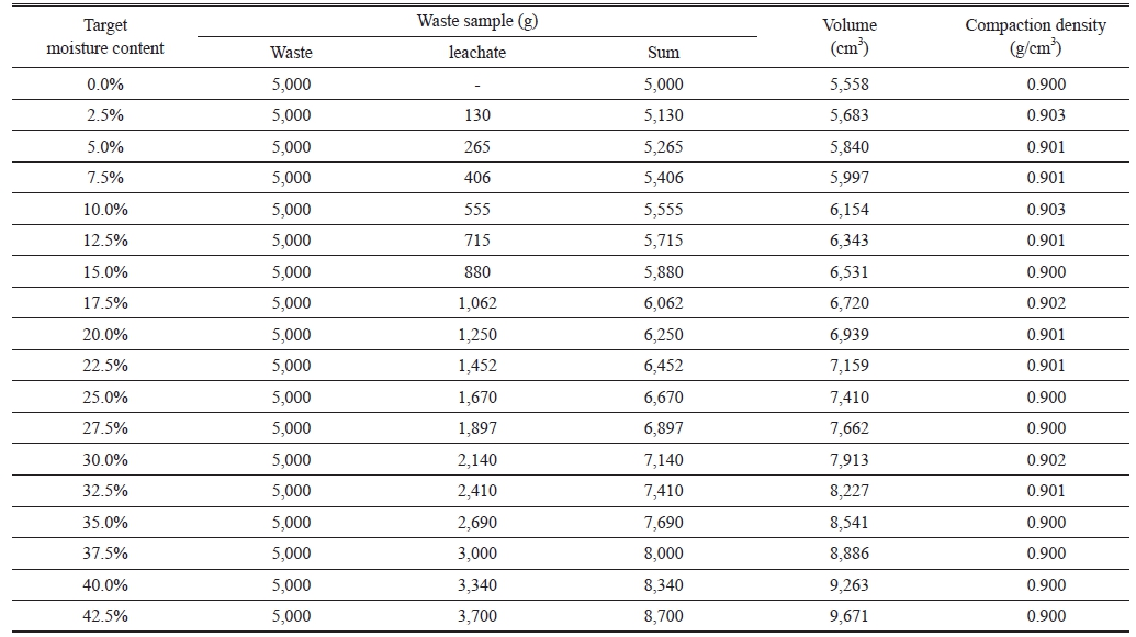 침출수 혼합에 따른 폐기물의 함수율 변화를 측정하기 위해, 굴착 폐기물을 110oC 온도에서 12시간 동안 Oven dryer에 넣어 완전히 건조 시킨 후, Table 2와 같이 침출수를 중량 기준으로 혼합하여 각각의 시료를 제작하였다.