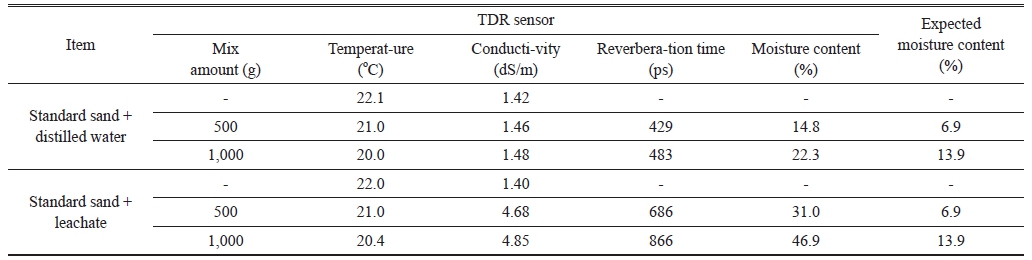표준사(7,200 g)와 주입 물질을 증류수, 침출수로 각각 혼합량의 변화를 주면서 TDR 센서로 측정한 온도, 전기전도도, 반향 시간(pico second, ps), 함수율 측정 결과를 아래 Table 3에 정리하였다.