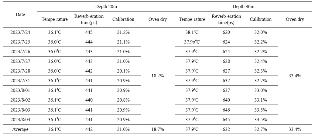 실내 실험을 통해 도출된 보정식의 신뢰도 검증 및 현장 적용성을 평가하기 위해, 해당 매립지에 10일 동안 20 m, 30 m 깊이로 TDR 센서를 설치하고 현장 실험을 진행하였다. 실험 중에는 침출수 주입이나 강수 등 외부 수분이 매립지 내부로 유입되지 않는 상태로 유지하였다. 또한 TDR 센서 설치 과정에서 센서가 설치되는 위치의 굴착 폐기물은 직접 채취하여 Oven dry 함수율을 별도로 측정하여 보정식을 통해 계산된 함수율과 비교하였다.
