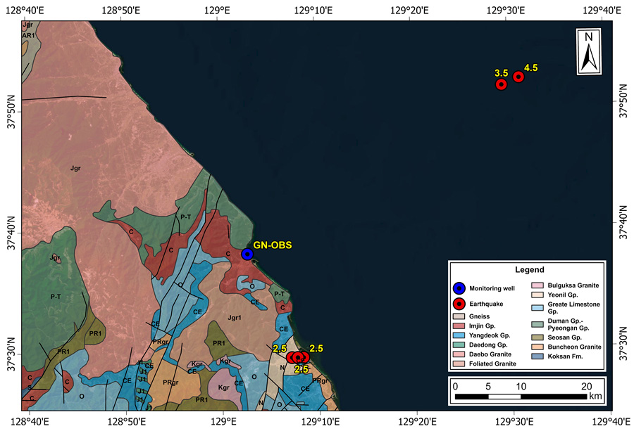 *Five earthquakes in which changes in groundwater level were detected in Gangneung observation wells are shaded. |