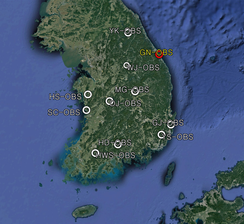 본 연구에 활용된 지하수 관측정은 한국지질자원연구원 지하수환경연구센터에서 운영 중인 강릉 지하수 관측정이다. 전국에 총 11개의 관측소가 위치하여 지하수, 토양, 기상 요소를 관측한다(Fig. 2). 각각의 세부 관측 항목을 살펴보면 지하수는 지하수위, 온도, 전기전도도(EC: Electrical Conductivity), 토양은 수분함량, 온도 그리고 기상은 풍향, 풍속, 온도 및 습도 등이 있다. 본 연구에서는 동해 소규모 지진에 의한 지하수위 변동 특성을 파악하기 위해 지진 진앙지와 가장 근거리에 위치하고 있는 강릉 관측정(GN-OBS: Gangneung-Observation Borehole Station)의 지하수위 데이터를 분석하였다. 지하수위 데이터는 국내에서 처음으로 관측된 1초 측정 간격 데이터를 활용하여 동해 근처에서 발생한 다양한 지진자료와 비교 분석하였다.