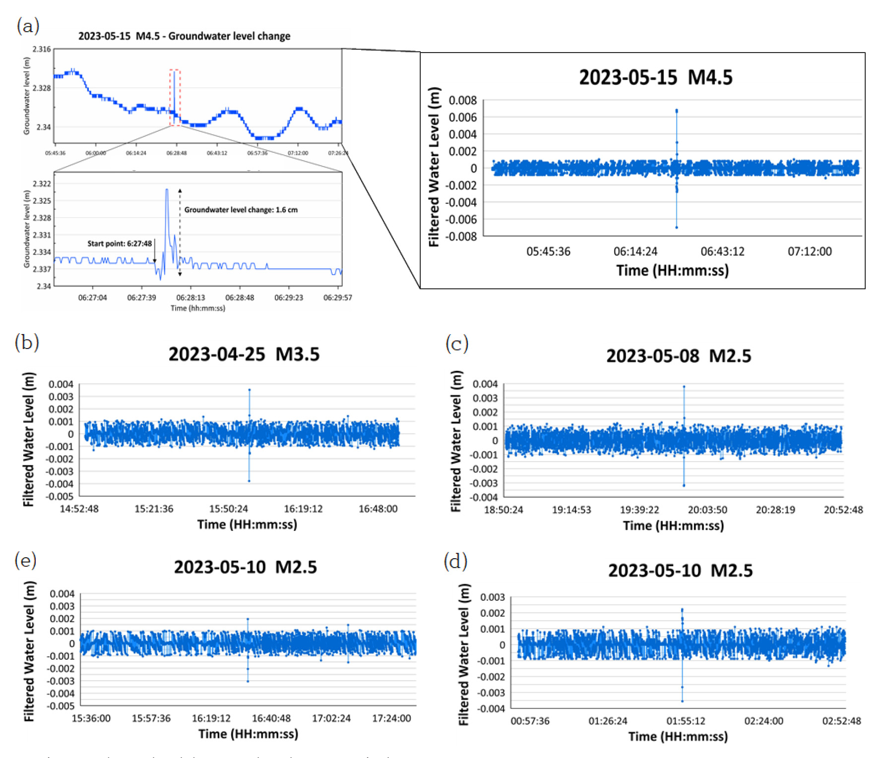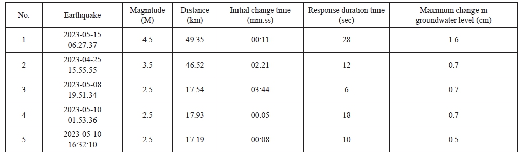 관측된 5개 모두 지진 발생 후 4분 이내에 지하수위 변동이 감지되었으며 변동 지속 시간은 평균 15초로 관측되어, 수위 회복이 단기간에 정상적으로 나타났다는 것을 알 수 있다. 지하수위 변동 폭은 0.5~1.6 cm의 범위를 나타냈고, 관측정과 진앙지와의 거리는 17~49 km 범위였으며, 규모는 M2.5~4.5 범위로 관측되었다(Table 2). 감지된 5개의 지진을 발생 순서대로 살펴보았을 때, 4월 25일에 발생한 M3.5의 지진은 지진 발생 시각에서 2분 21초 후인 15시 58분 16초에 지하수위 변동이 나타났다. 변동 지속 시간은 12초였으며, 최대 변화 폭은 약 0.7 cm로 수위 상승 및 하강이 나타났다. 이후, 5월 8일에 발생한 M2.5 지진은 발생 시각에서 3분 44초인 후인 19시 55분 18초에 지하수위 변동이 나타났다. 최대 약 0.7 cm의 수위 변동이 발생하였으며, 수위 변동은 6초간 지속되었다. 5월 10일에는 M2.5 지진이 두 차례 발생하였다. 각각 지진 발생 시각 5초와 8초 후인 1시 35분 41초와 16시 32분 18초에 지하수위 변동이 관측되었다. 또한 각각 최대 약 0.7 cm와 약 0.5 cm의 수위 변동이 나타났으며 두 변동 모두 20초 이내에 수위가 회복되었다. 감지된 지진 중 최대 규모인 M4.5 지진은 5월 15일에 발생 시각의 11초 후인 6시 27분 48초에 지하수위 변동이 시작되었다. 최대 약 1.6 cm의 수위 하강 및 상승이 발생하였으며, 수위 변동은 28초 동안 지속된 후 회복되었다.
