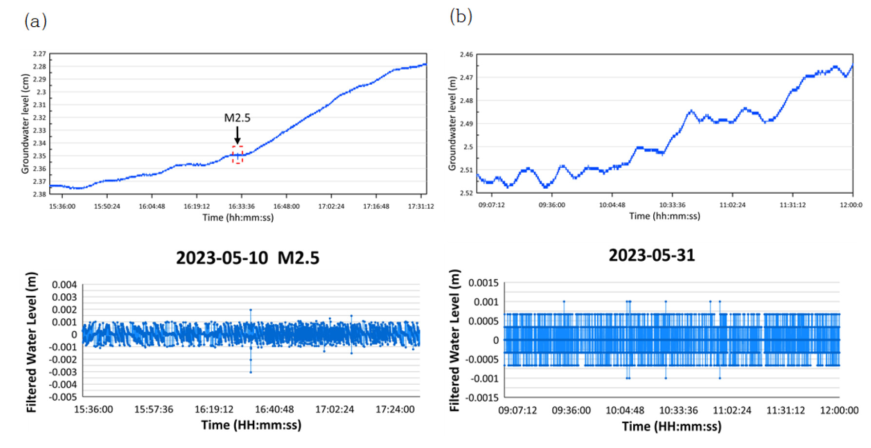 연구 기간 중 지진으로 인한 지하수위 변화가 유의미한 결과임을 확인하기 위하여 지진 발생이 없던 기간을 임의로 지정하여 분석하였다. 2023년 5월 31일 09시부터 12시까지 지하수위 데이터를 본 연구에 활용된 필터링 기법으로 수행하였다. Fig. 4는 지진 발생으로 인한 순간적인 변화를 필터링 기법을 활용하여 관측한 그래프와 지진 발생이 없을 때의 필터링 기법을 적용한 그래프이다. 필터링 기법을 통해서 지진으로 인한 지하수위의 순간적인 변화가 관측된 것을 비교 분석을 통해 확인하였다.