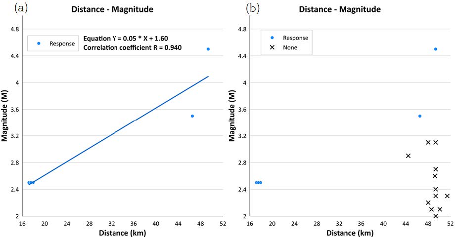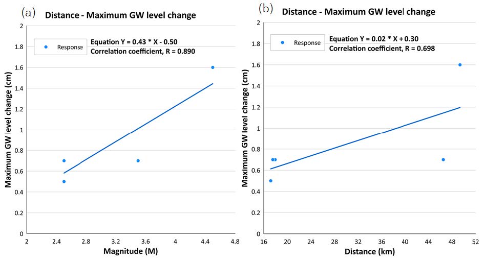 같은 관측정 안에서 규모 및 진앙거리에 대한 지하수위 변동 크기의 연관성을 파악하기 위해 지진 규모와 진앙거리 간의 상관관계를 산정하였다. 연구기간 중 총 17번의 지진 중 강릉 관측정에서 지하수위 변화가 감지된 지진 중 가장 큰 규모인 M4.5 지진은 약 49 km의 진앙거리를 가지고 있었으며, M3.5의 지진은 약 46 km의 진앙거리를, M2.5의 지진들은 약 17 km의 진앙거리를 가지고 있었다. 이를 통해 얻은 상관관계 식과 상관계수는 아래와 같다(Fig. 5 (a)).