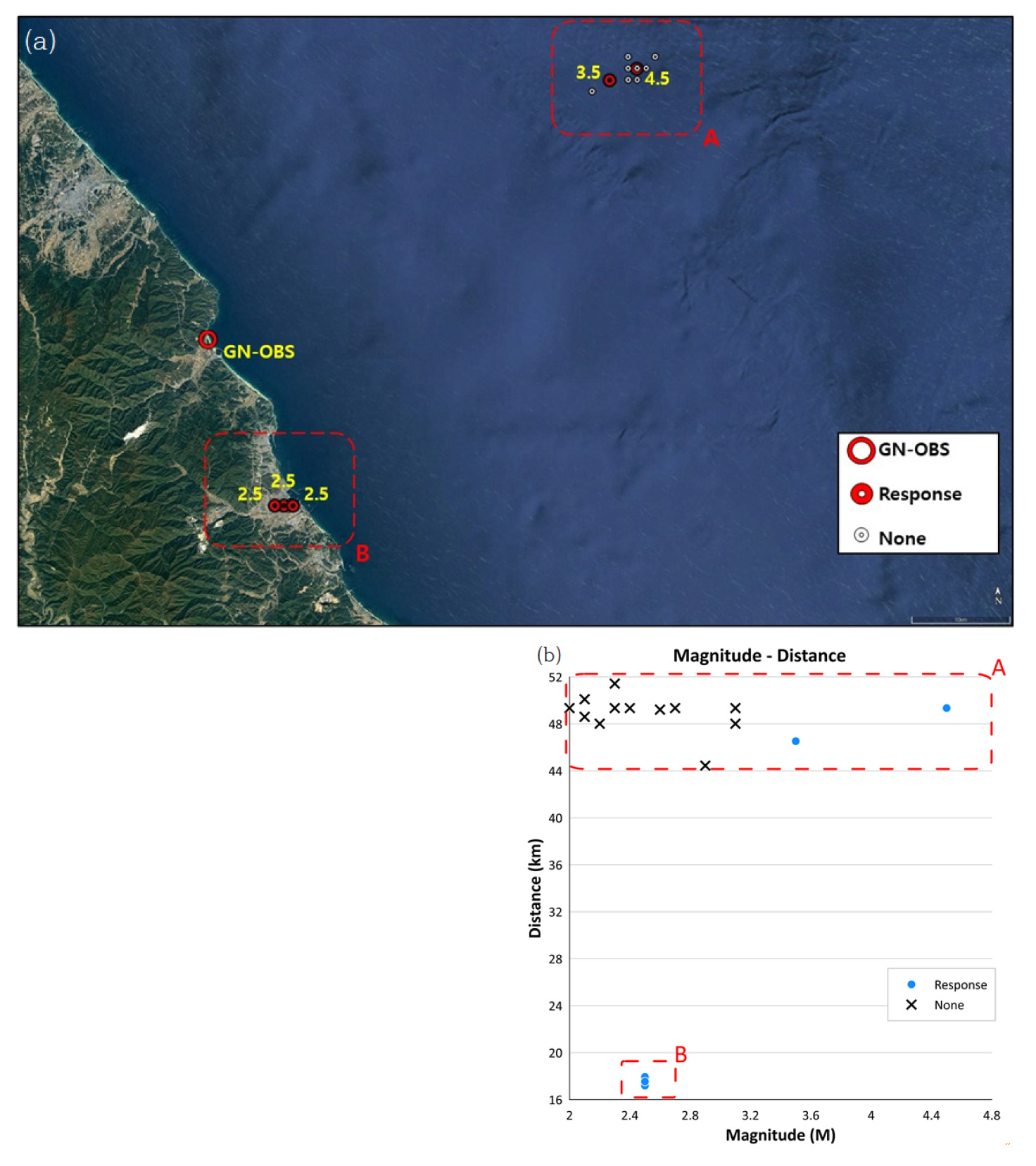 도출된 그래프를 통해 강릉 관측정이 반응하는 소규모 지진의 진앙거리와 규모를 파악할 수 있다. 관측정에서 감지된 5개의 지진 외에 감지되지 않은 12개의 지진은 진앙거리 44 km 이상 52 km 이하로 나타나며, M2.0 이상 M3.1 이하에 분포되어 있다(Fig. 5 (b)). 또한 Fig. 6 (a, b)를 보면, 강릉 관측정으로부터 특정한 진앙거리와 지진 규모에 따라 A와 B 구역으로 나누어 비교할 수 있다. A 구역은 진앙거리 44 km 이상 52 km 이하의 해역에서 발생한 지진으로, M2.1부터 M4.5까지 다양한 진앙거리를 보이며 분포한다. B 구역은 진앙거리 16 km 이상 20 km 이하의 내륙 및 내륙과 밀접해 있는 해안 지역에서 발생한 지진으로, M3.0 이하의 지진이 비교적 단일한 진앙거리를 보이며 분포한다. 하지만 그 중, A 구역에서 지하수위 변동이 감지된 지진은 M3.5와 M4.5이다. 이는 규모가 작은 지진은 진앙지와의 거리가 짧을 때 강릉 관측정이 변동을 감지할 수 있는 것으로 보인다. 따라서 강릉 관측정은 진앙거리 약 17 km 이내에서 나타나는 M2.5 이상의 지진과 진앙거리 약 46 km 이내에서 나타나는 M3.5 이상의 지진에 영향을 받아 지하수위 변동이 발생한 것으로 판단된다.