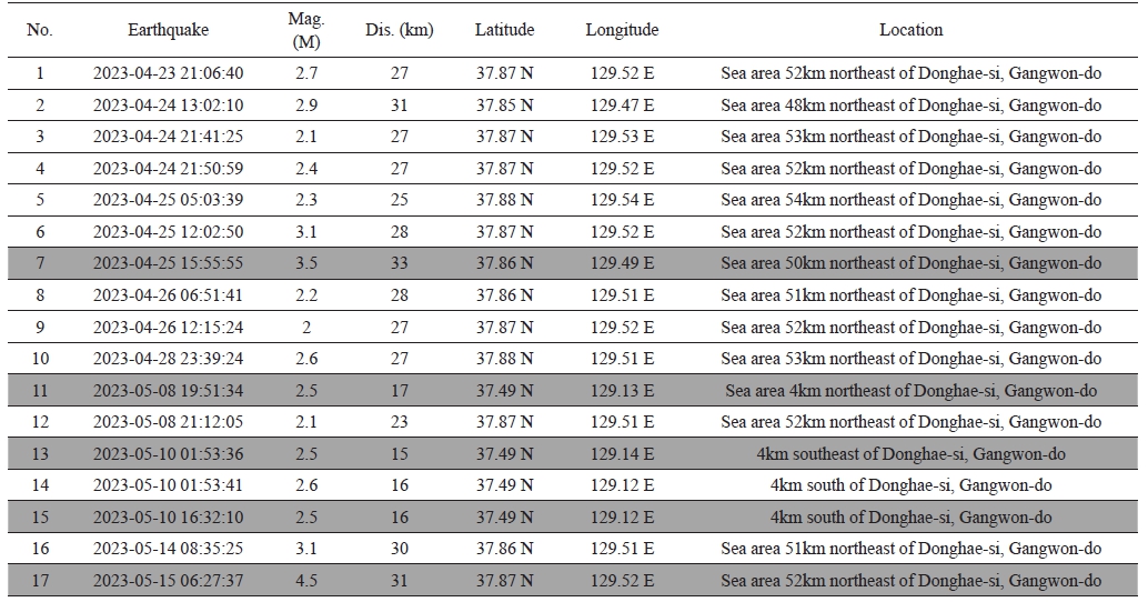 본 연구는 2023년 4월 23일부터 2023년 5월 22일까지, 한 달간 동해안 인근 지역에서 발생한 지진을 분석하였으며, 기상청 자료에 따르면 M2.0 이상 M4.5 이하의 연속지진이 17개로 집계된다(Table 1). 또한 M2.0 미만의 지진은 47회 발생하여 연구기간 동안 총 64회의 지진이 발생하였다. 미소지진 및 소규모 지진의 잦은 발생으로, 동해 지구조 환경과 지진에 따른 2차 피해에 관한 관심이 증대되고 있다.