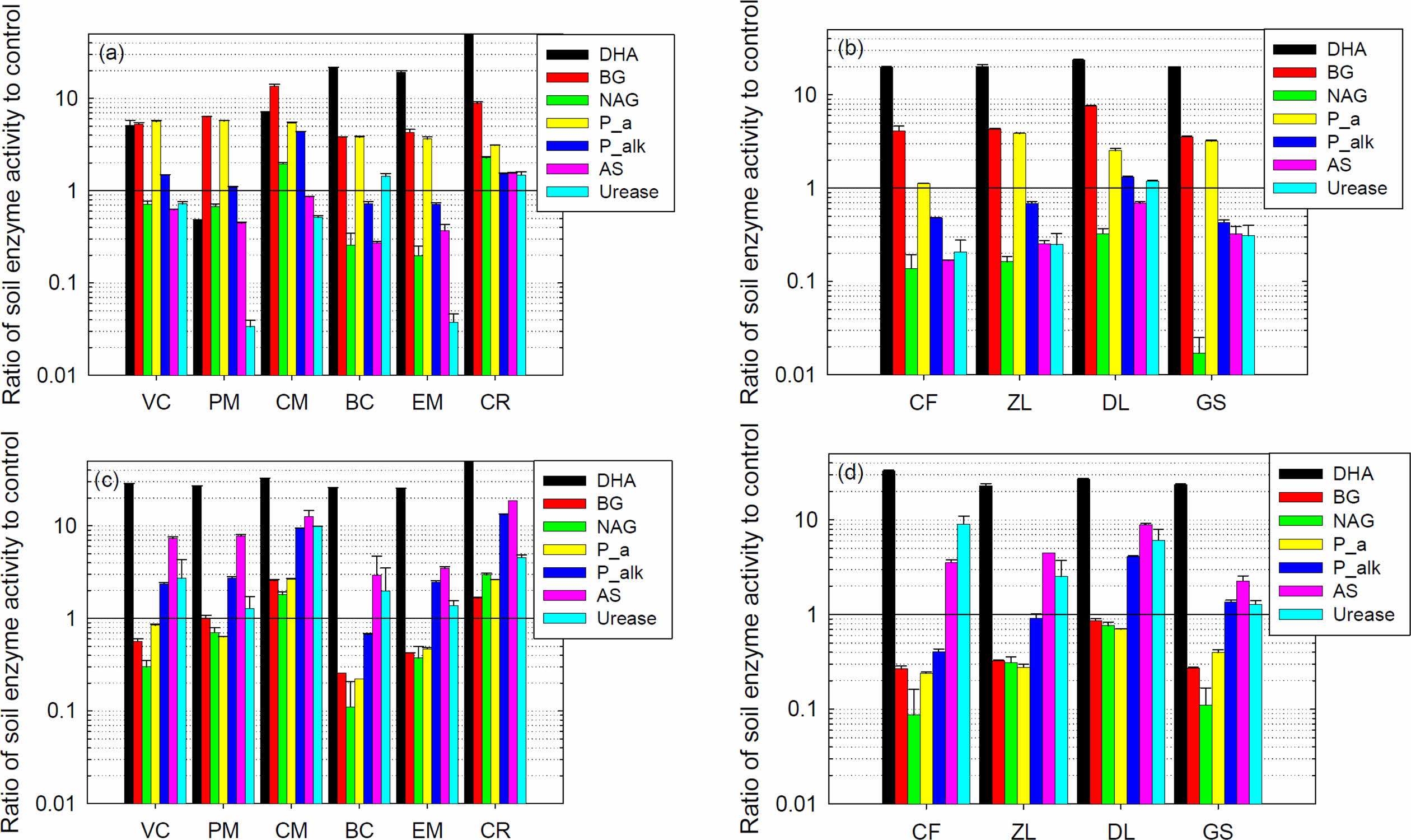 Fig. 1 Comparing the soil enzymes activity in each amendment treatment to the control. (a) DDC soil with organic amendments, (b) DDC soil with inorganic amendments, (c) YJ soil with organic amendments, (d) YJ soil with inorganic amendments. Vitamin B was the cause of the unusually high DHA, 1,132 gTPF/g-soil in DDH soil, and 2416 1,132 gTPF/g-soil in YJ soil, in the CR (chlorella) treatment; precise values were not shown in the figures (a) and (c). |