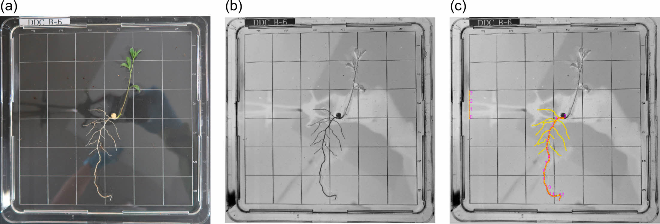 Fig. 2 Steps of image processing for estimation of root length and volume. (a) original digital image, (b) conversion to an 8-bit RGB image by ImageJ, (c) root identification and estimation of length/volume by the SmartRoot program, which shows the main root in red and the secondary root in yellow. |