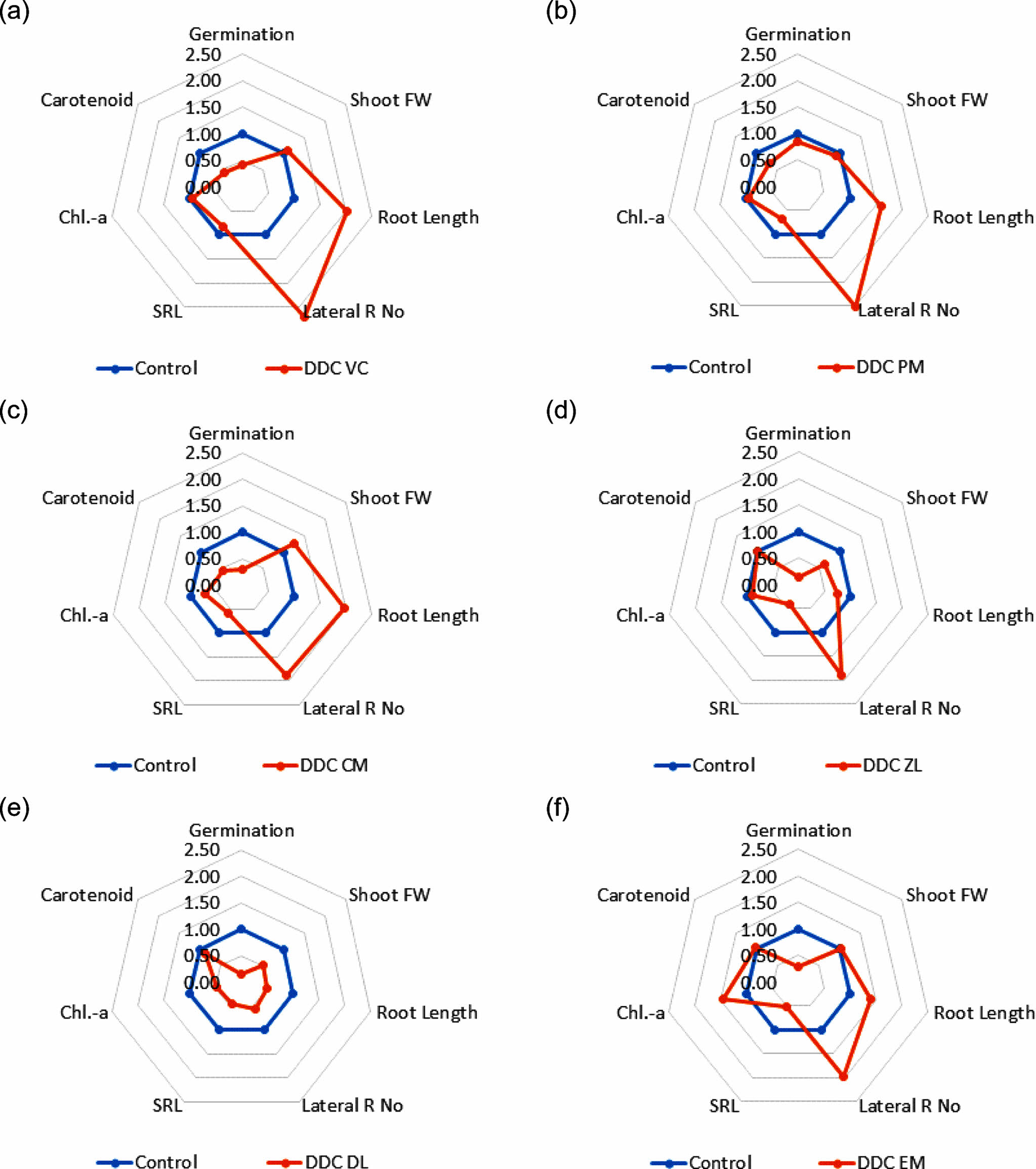 Fig. 3 Radar graph showing comparison of seven indices of lentil germination and growth on reclaimed DDC soils with amendment relative to nursery soil. Each value of plant growth index on nursery soil was set to 1.0. (a) amended with vermicompost, (b) amended with peat moss, (c) amended with chicken manure, (d) amended with zeolite, (e) amended with dolomite lime, (f) amended with EM product. |