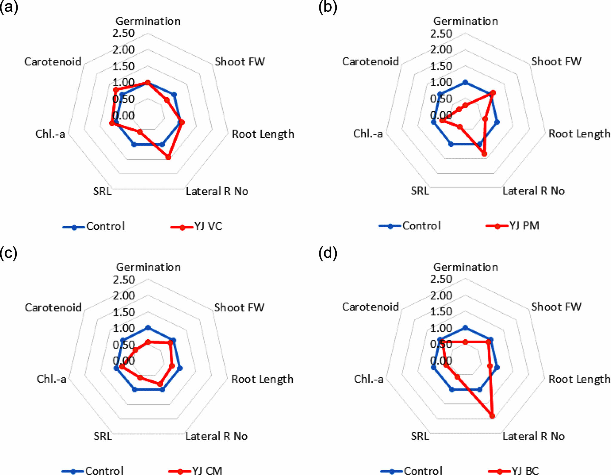 Fig. 4 Radar graph showing comparison of eight indices of lentil germination and growth on reclaimed YJ soils with amendment relative to nursery soil. Each value of plant growth index on nursery soil was set to 1.0. (a) amended with vermicompost, (b) amended with peat moss, (c) amended with chicken manure, (d) amended with biochar. |