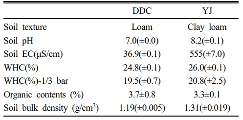 용적밀도, 토양수분함량(보수력), 유기물함량을 NIFS(2014) 방법에 의거하여 2배수로 측정하였다. 토양 pH 및 EC는 토양:증류수(1:5) 방법으로 측정하였고 토성은 피펫법, 유기물함량은 강열감량법으로 측정하였다.