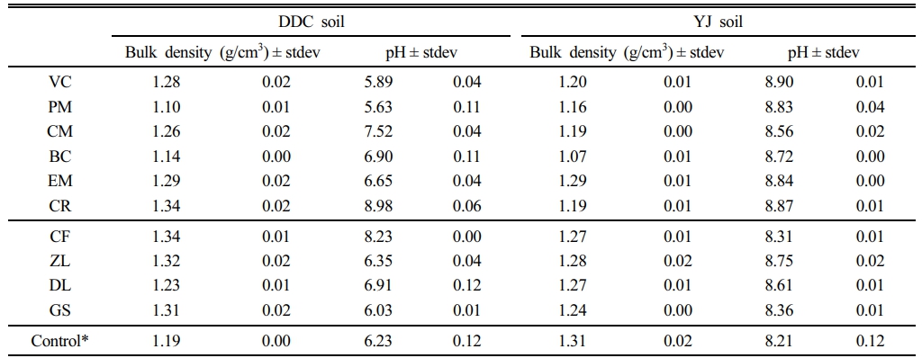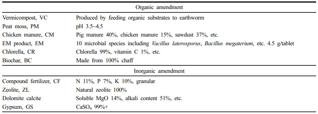 실험에 사용한 2종 토양은 TPH 오염토양을 토양경작법으로 처리한 토양(DDC soil)과 열탈착 처리한 토양(YJ soil)으로, 그 특성은 Table 1과 같이 DDC 토양은 양토이고, YJ토양은 식양토이었다. 토양에 첨가한 첨가제는 분변토(vermicompost, VC), 피트모스(peat moss, PM), 계분퇴비(chicken manure, CM), EM 제제(EM product, EM), 클로렐라(chlorella, CR), 바이오차(biochar, BC)의 유기성 첨가제 6종과 복합비료(compound fertilizer, CF), 제올라이트(zeolite, ZL), 석회고토(dolomite lime, DL), 석고(gypsum, GS)의 무기성 첨가제 4종이었다(Table 2).