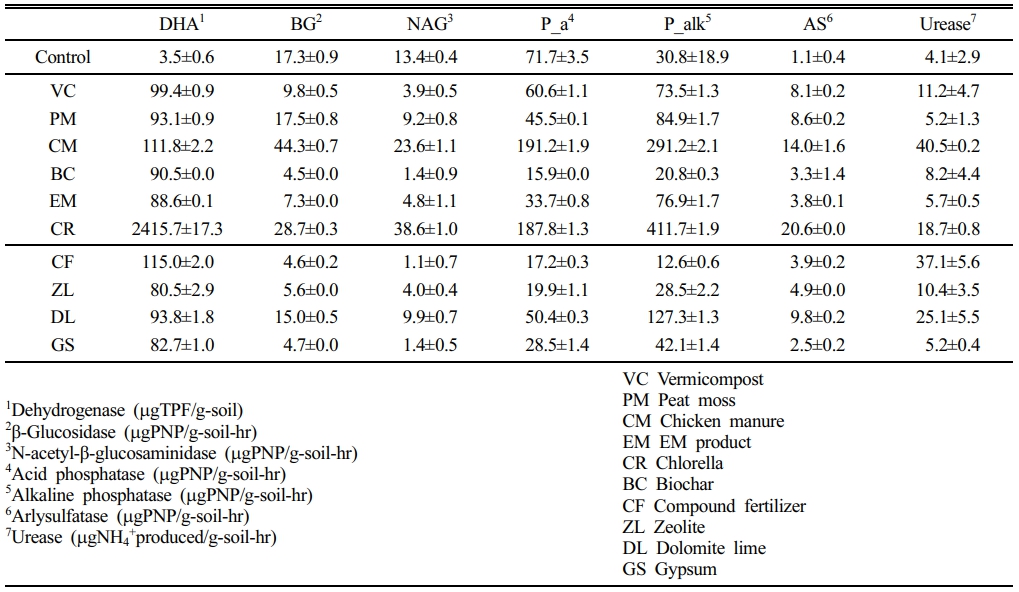 토양효소활성 측정 결과, 토양과 첨가제에 따라 큰 차이를 보였다. DDC 토양에서 DHA는 무처리구에서 4.0 mgTPF/g-soil이었으나, 유기질 및 무기질 처리군에서 각각 2.0~1132 및 80~94 mgTPF/g-soil로 크게 변화하여 첨가제에 의한 영향이 매우 큰 것을 알 수 있다(Table 4). 여기서 CR의 DHA가 매우 큰 값을 보인 것은 성분에 1% 포함되어 있는 vitamin C가 환원제로 작용하여 DHA와 동일한 탈수소 반응을 하였기 때문이다(Borsook and Keighley, 1933). 이 결과는 YJ 토양에서도 동일하였다.