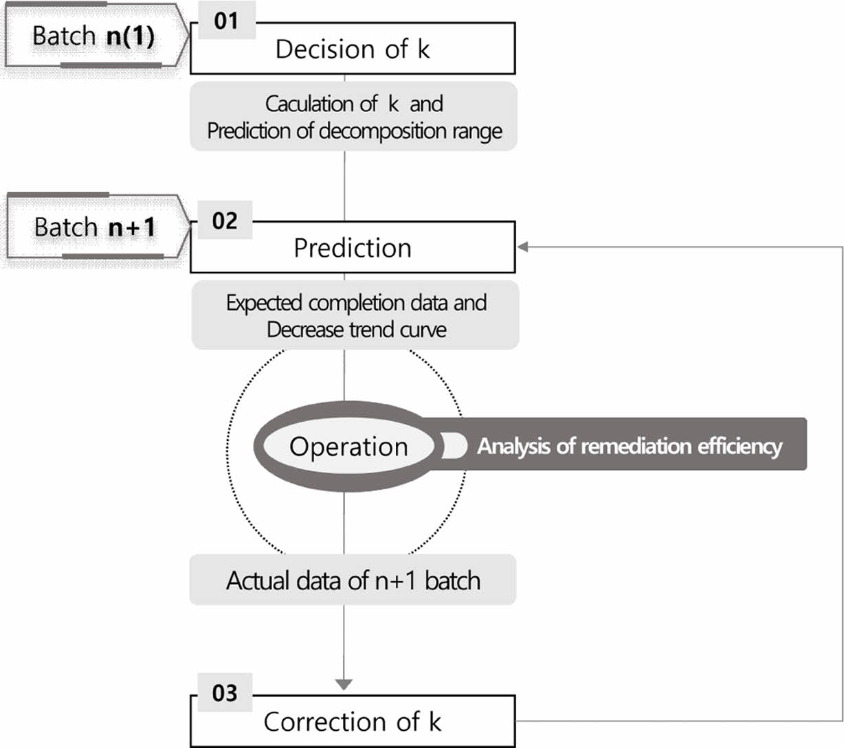 최초 배치(1배치)에서는 설계 분해속도상수로 5개 경작동의 예측경작일을 산정하였으며, 운전 결과에 따라 최대, 최소, 평균 분해속도상수를 산정하고 예측곡선을 작성하였다. 두 번째 배치부터 15배치까지 앞선 배치와 평균한 분해속도상수를 적용하여 다음 배치의 예측곡선과 예측경작일을 산출하였으며, 최대 및 최소 범위 이내에서 정화품질관리를 실시하였다.