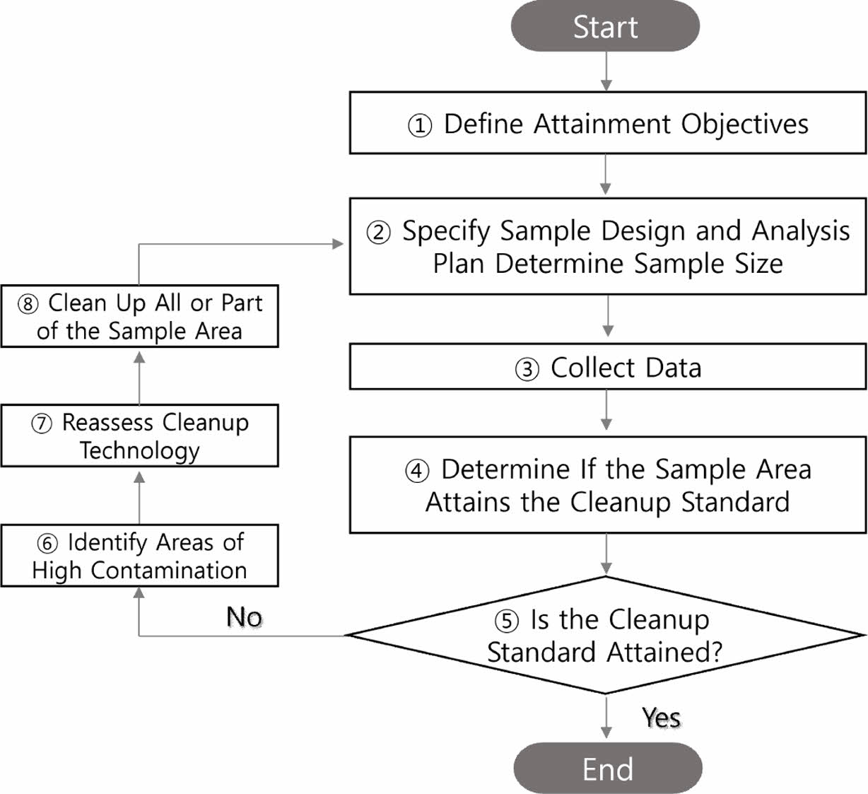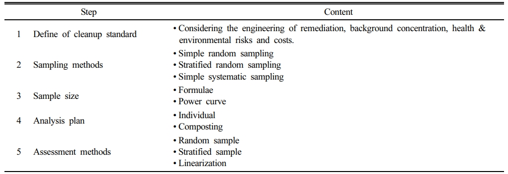 Fig. 2의 절차에 따라 부지의 정화완료 여부를 평가하기 위해서는 Table 4의 인자값을 단계적으로 결정해야 한다.