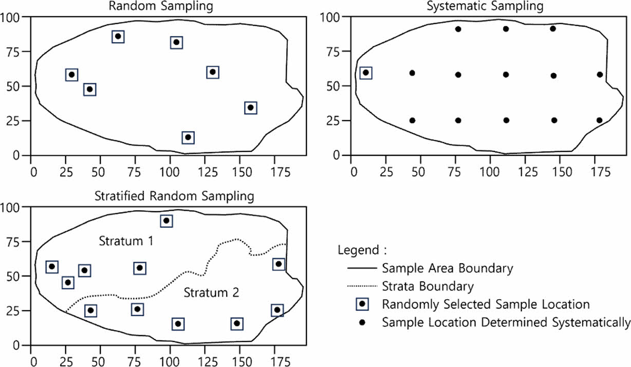 US EPA(1989)에서는 부지의 형태 및 농도의 분포에 따라 Fig. 3과 같이 3가지 시료 채취방 법을 제시하고 있다. 시료 채취 방법에 따라 농도평가값(mua)의 산정식이 달라지므로 부지의 특성에 맞게 시료 채취 방법을 결정해야 한다.