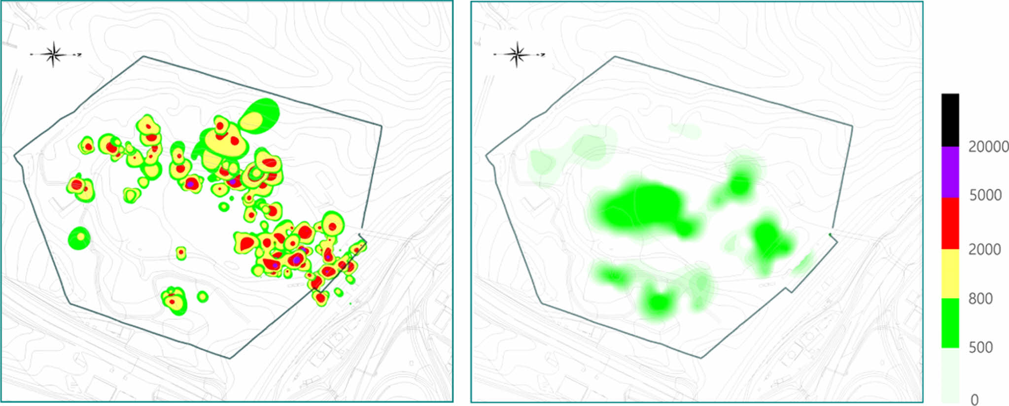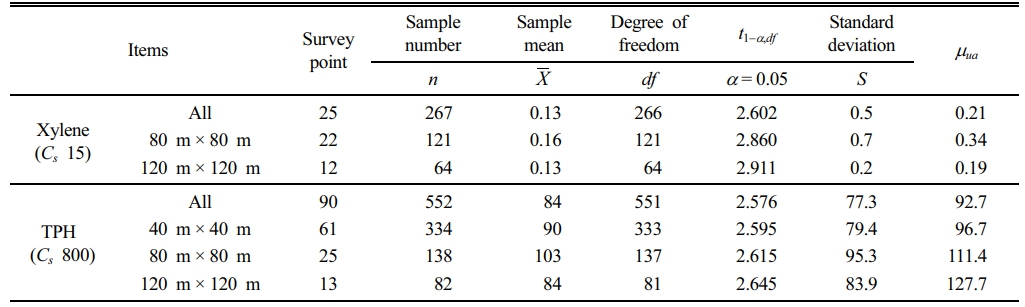총 조사시료 및 격자 구획별 조사시료에 대한 농도평가값은 Table 13과 같다. xylene의 농도평가값은 총 조사시료의 평균으로 산정한 경우는 0.21, 80 m 정방형 격자의 경우는 0.34, 120 m 정방형 격자의 경우는 0.19로 모두 xylene의 정화평가 기준(15 mg/kg)보다 낮았다. 또한 TPH의 농도평가값은 총 조사시료 평균으로 산정한 경우는 92.7, 40 m 정방형 격자의 경우는 96.7, 80 m 정방형 격자의 경우는 111.4, 120 m 정방형 격자의 경우는 127.7로 모두 TPH의 정화평가 기준(800 mg/kg)보다 낮았다. 이상으로 xylene과 TPH는 모든 경우에 정화평가 기준 이하였으므로 본 대상부지를 ‘정화 완료’로 판정하였다.