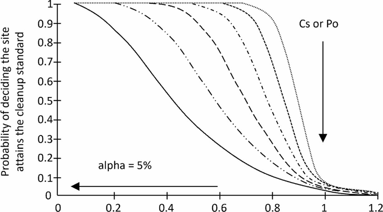 본 부지의 조사 지점수 결정을 위한 통계적인 신뢰수준은 95%, 위양성율과 위음성율은 각각 0.05, 0.20을 적용하였으며, US EPA(1989)에서 제안된 식 (2), 식 (3) 및 검정곡선(Fig. 5)을 비교하였다.