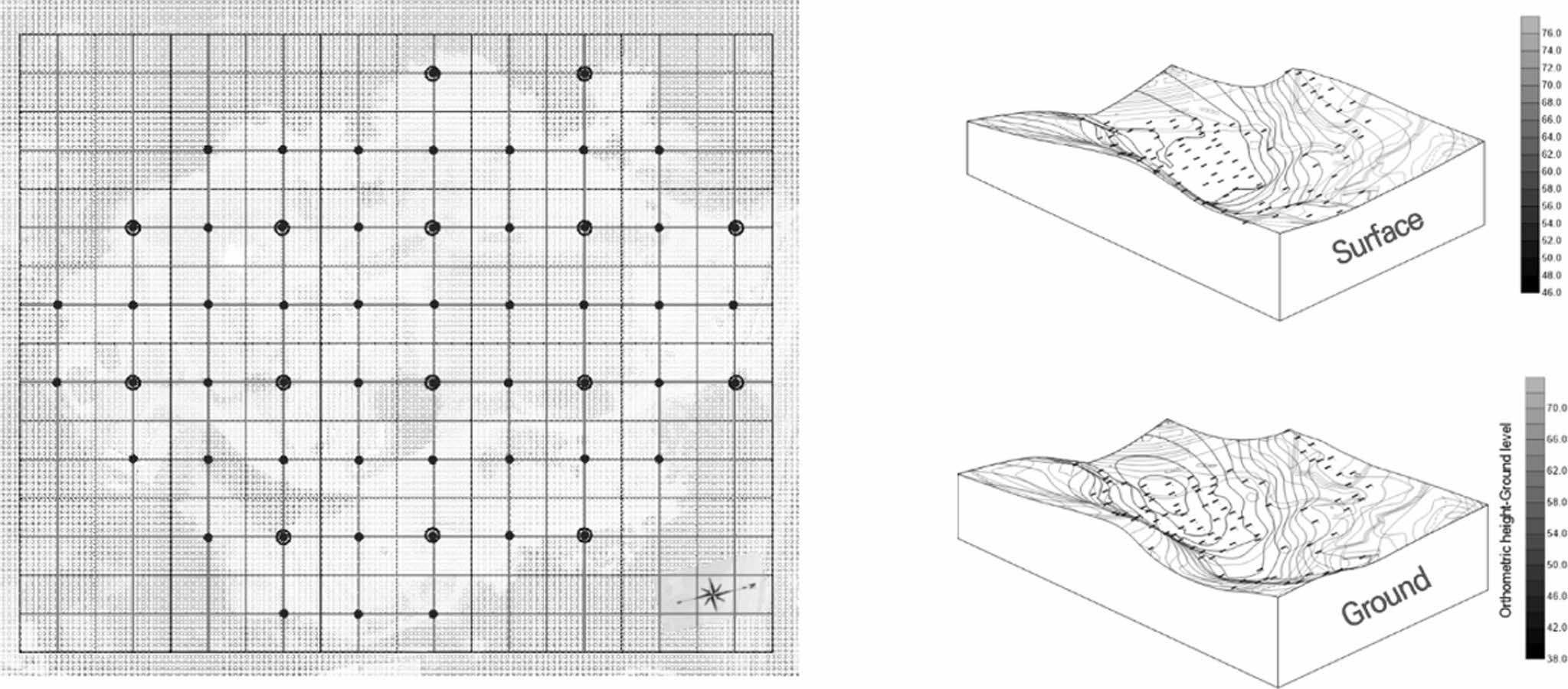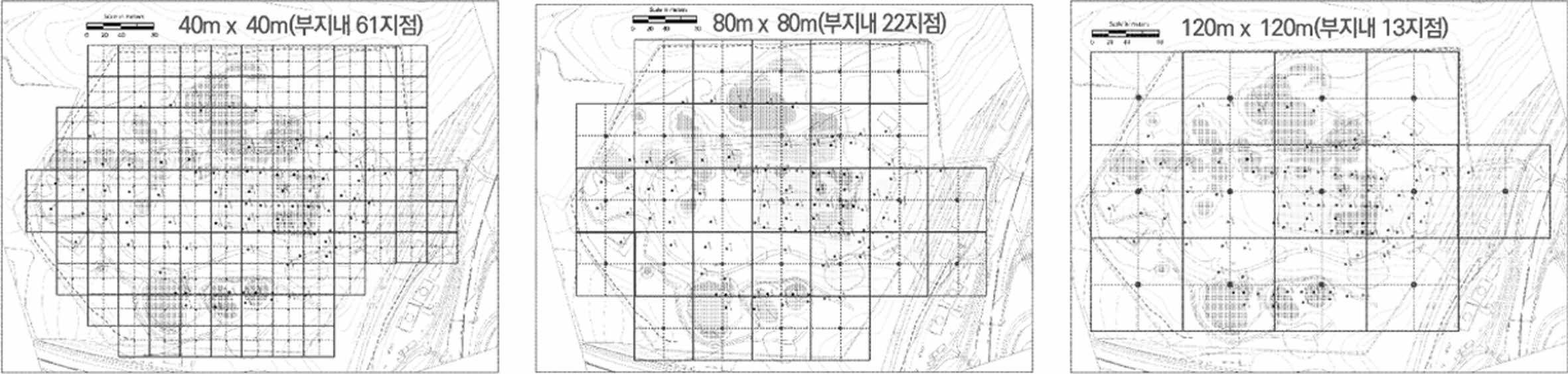 본 부지에서는 되메움 정화토가 부지내 넓게 분포하고 정화토의 농도 편차도 크지 않았으므로 systematic sampling을 채택하였다(Fig. 4). 조사 지점의 선정은 x축과 y축의 크기가 동일한 사각(square) 격자법을 사용하였다.