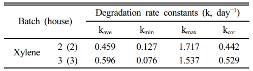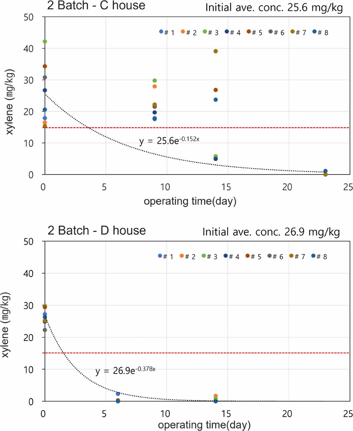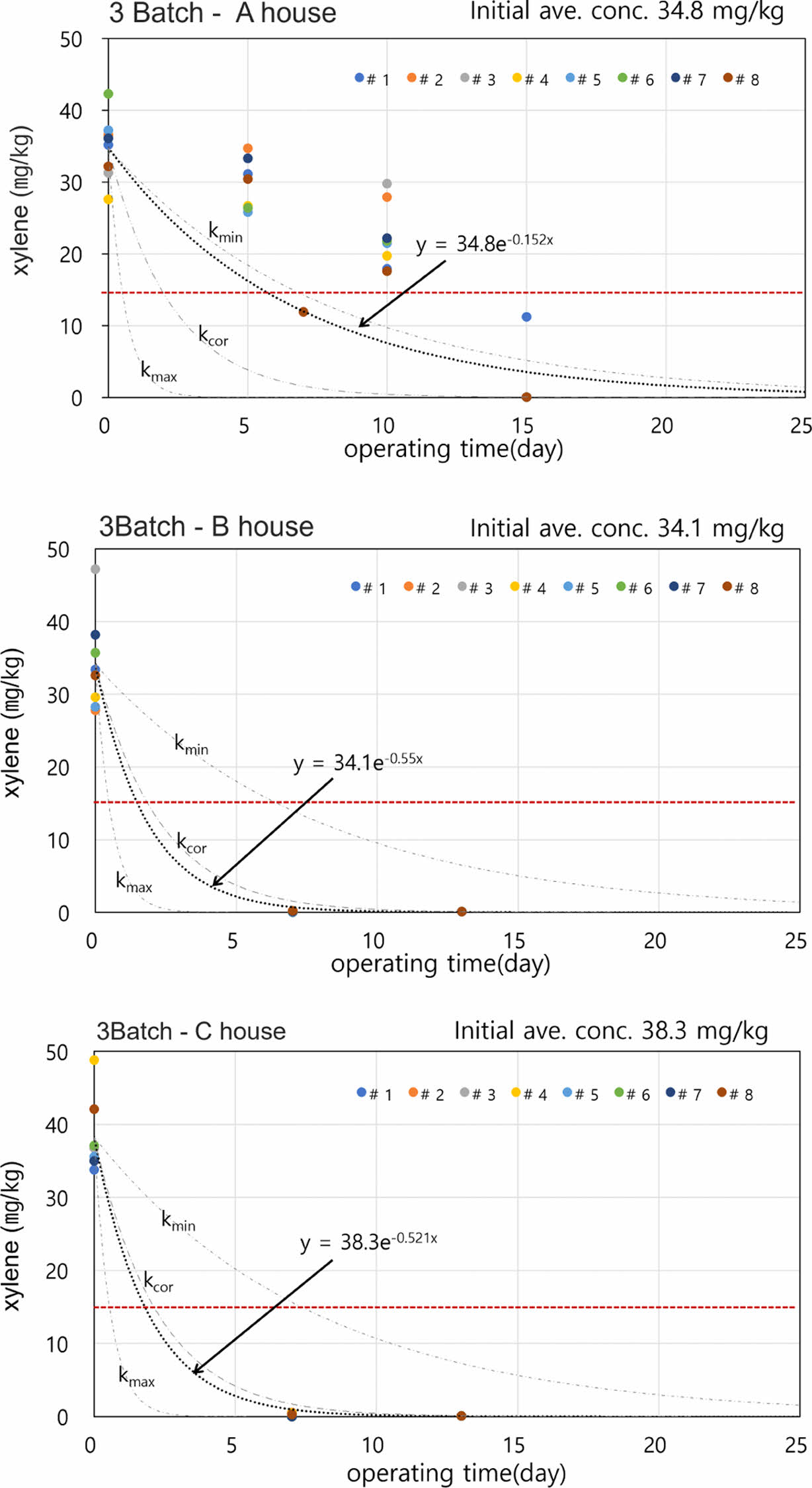 최초 배치의 경작일은 Fig. 7과 같이 C동 24일, D동 6일로 큰 차이를 보였다. 최초 배치의 운전 결과에 따라 두 번째 배치의 정화품질관리를 위한 최대(1.72 day¯), 최소(0.13 day¯), 평균(0.442 day¯) 분해속도를 산정하고 예측곡선을 작성하였다. 안전율(1.3)이 적용된 3배치 예측경작일은 A동(초기농도 34.8 mg/kg) 0.6~8.6일, B동(초기농도 34.1 mg/kg) 0.6~8.4일, C동(초기농도 38.3 mg/kg) 0.7~9.6일로 예측되었다. 정화 결과 정화목표 농도에 도달한 경작일은 Fig. 8과 같이 A동은 15일, B동은 7일, C동은 7일이었다. B동 및 C동의 모든 방형구에서 xylene 감소는 예측 범위 이내였으나, A동의 경우에는 대부분의 방형구에서 예측곡선의 최소 분해속도보다 낮았다. A동은 예측경작일 경과 후에는 경작 인자(미생물 수, 질소·인 농도)와 운전 조건(경운, 수분 공급)을 점검하고 정화를 완료하였다. 이상의 xylene 정화품질관리에 사용된 분해속도상수는 Table 7과 같다.