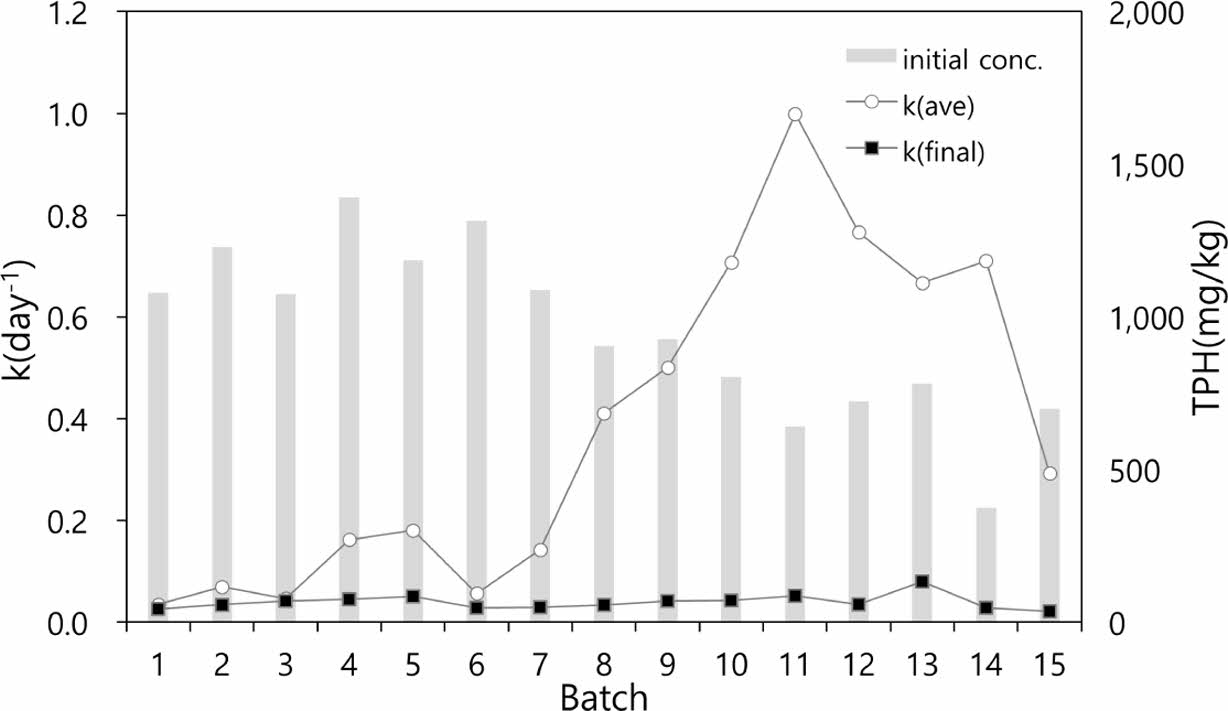 그러나 반입 농도 3,500 mg/kg 이상의 경우에는 초기의 빠른 분해는 거의 이루어지지 않았으며, 느린 분해(k < 0.01, 100%)만으로 정화가 이루어졌다. 이상의 결과에서 반입 농도가 낮을수록 TPH 분해는 다양한 속도로 이루어지는 반면, 반입 농도가 높은 경우(특히, 3,000 mg/kg 이상)에는 계획(설계 분해속도상수)보다 낮은 분해속도를 유지하였다.