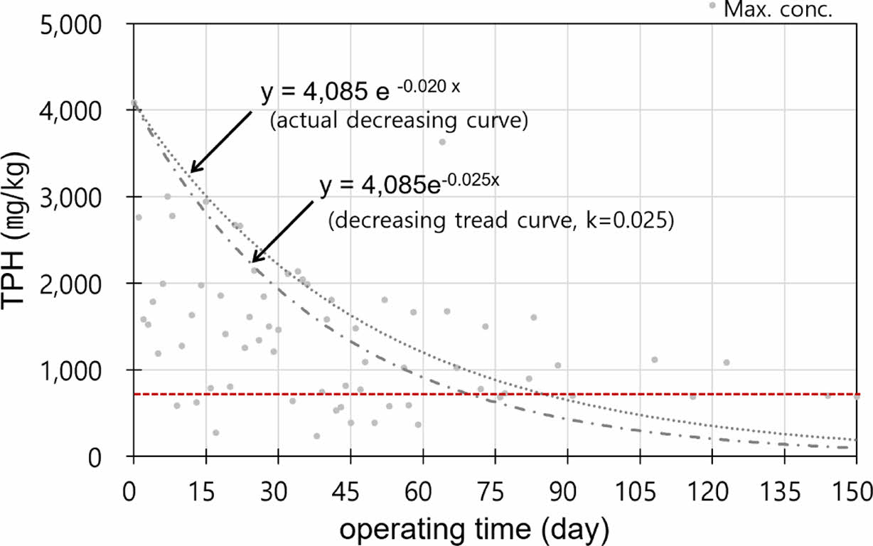 Fig. 10은 경작일 150일을 기준으로 경작일 별 TPH 최대 농도에 대한 저감 추세를 나타낸 것이다. TPH 최대 농도의 감소 추세선에 의한 분해속도상수(0.020 day¯)는 설계 분해속도상수(0.025 day¯)와 큰 차이를 보이지 않았다. 경작일은 평균 13.8일(최소 1일, 최대 144일), 운전일은 평균 36.6일(최소 20일, 최대 162일)로 대부분의 경작동은 설계 기간(81일)보다 짧게 운영되었다. 이는 반입 TPH 농도(최대 1,884 mg/kg)가 설계 TPH 농도(4,000 mg/kg) 보다 낮은 것에 기인하였다.