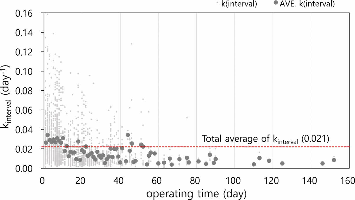 TPH 구간 분해속도상수(2,313개)는 Fig. 11과 같다. 구간 분해속도상수는 평균 0.021(최소 0.04, 최대 0.034) day¯로 설계 분해속도상수와 큰 차이는 없었다.