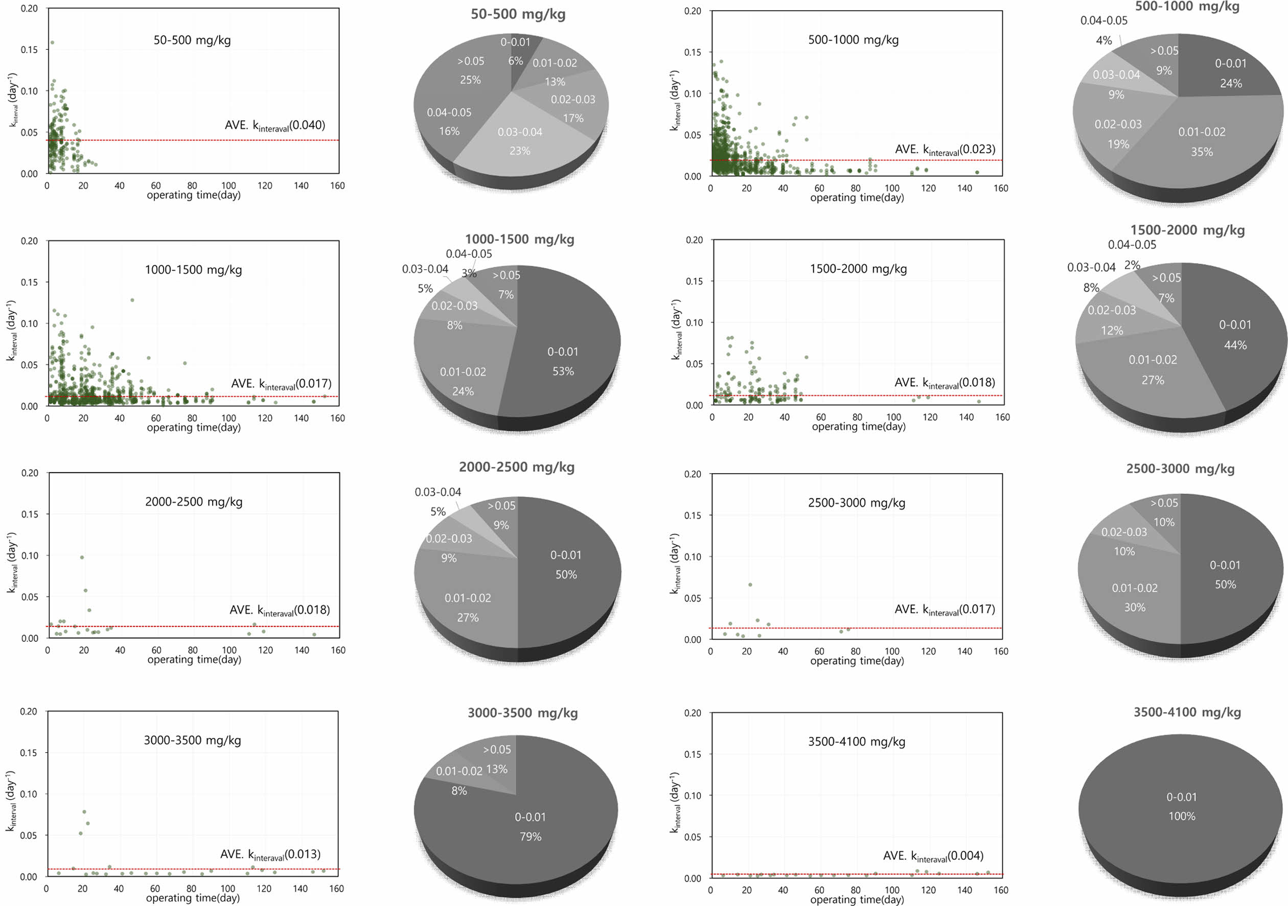 경작장 반입 농도에 따른 TPH 구간 분해속도상수의 분포와 점유율은 Fig. 12와 같다. 구간 분해속도상수는 반입 농도 1,000 mg/kg이하에서는 평균 0.023~0.040 day¯, 1,000~3,000 mg/kg에서는 평균 0.017~0.018 day¯, 3,000 mg/kg 이상에서 평균 0.004~0.013 day¯로 산정되었다. 전반적으로 반입 농도의 증가에 따라 구간 분해속도상수의 값은 감소하였으며, 가장 많은 반입 농도 1,000~3,000 mg/kg에서 구간 분해속도는 거의 차이가 없었다. 반입 농도 1,000~2,500 mg/kg의 경우에는 경작 초기의 빠른 분해(k > 0.05, 7~9%)가 이루어진 후 느린 분해(k < 0.01, 44~53%)가 지속되었다.