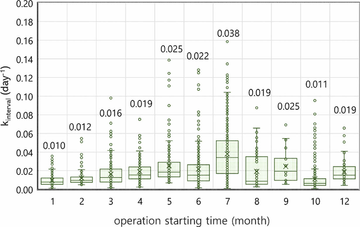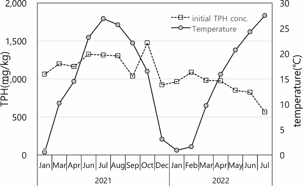 오염토가 반입된 시기가 경작 효율에 주는 영향을 확인하기 위하여 오염토가 경작장으로 반입된 월(month)과 TPH 구간 분해속도상수의 상관관계를 분석하였다(Fig. 14). 평균 구간 분해속도상수는 7월에 가장 높고 1월에 가장 낮았으며, 5월~7월은 구간 분해속도상수의 범위도 넓고 평균도 높았다. 경작은 2021년 1월~2022년 8월까지 진행되었으며, 본 정화 부지에서 가장 가까운 지역(대구)의 월평균 기온은 Table 10과 같다. 2021년 및 2022년 7월의 평균 기온이 년 중 가장 높았으며, 이는 7월 구간 분해속도상수가 가장 높은 것이 온도와 연관되어 있음을 보여준다.