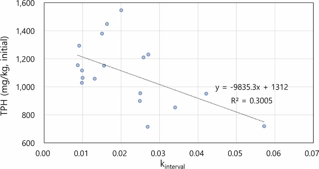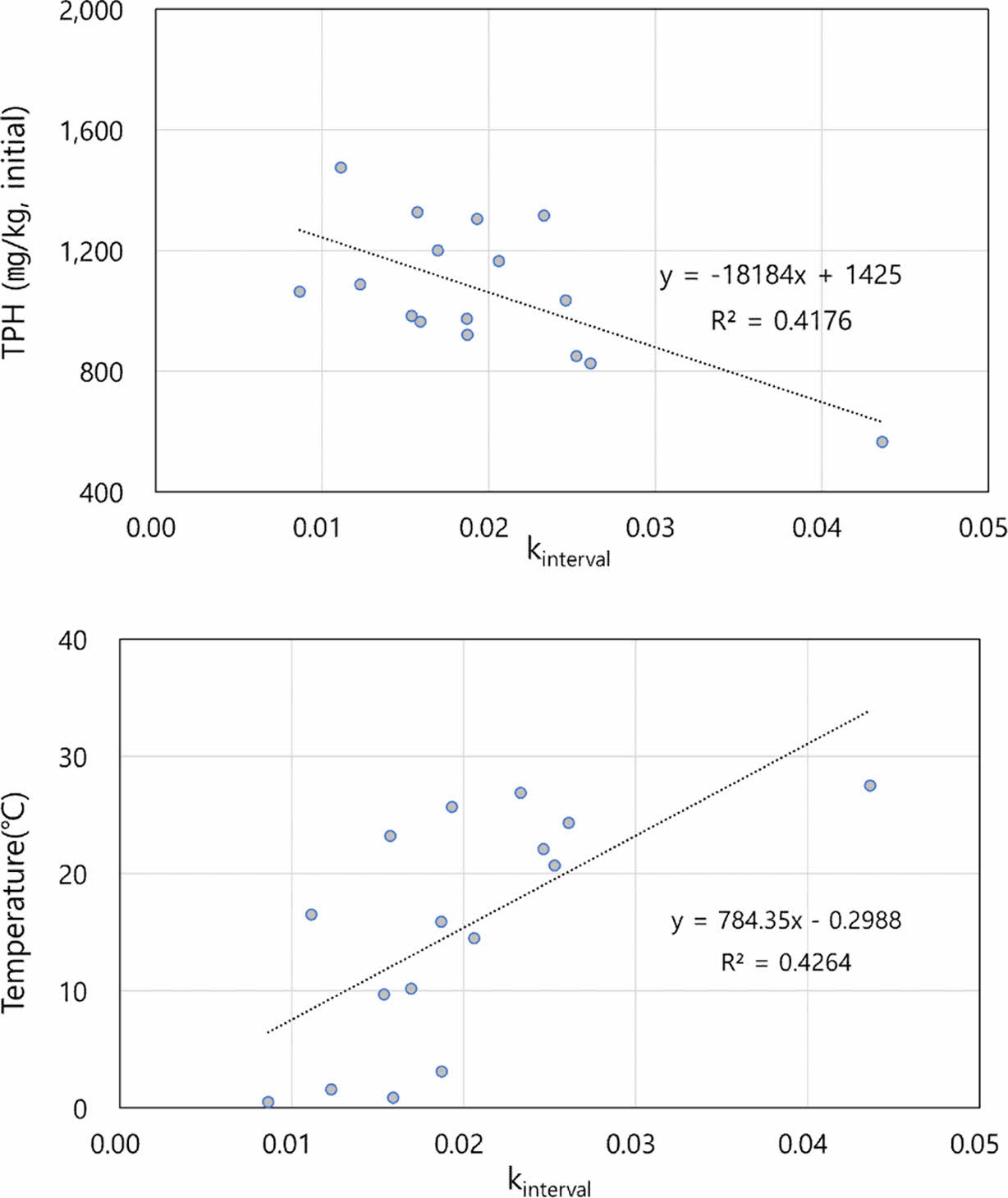 경작장의 정화평가는 xylene의 경우 5동만 이루어졌으므로, 57동의 경작이 수행된 TPH를 대상으로 수행하였다. 경작장의 TPH 분해속도와 현장 조건과의 연관성을 확인하기 위하여 TPH의 경작 기간의 구간별로 분해속도상수(이하, 구간 분해속도상수(kinterval))를 산출하고, 상관관계를 분석하였다.5)
