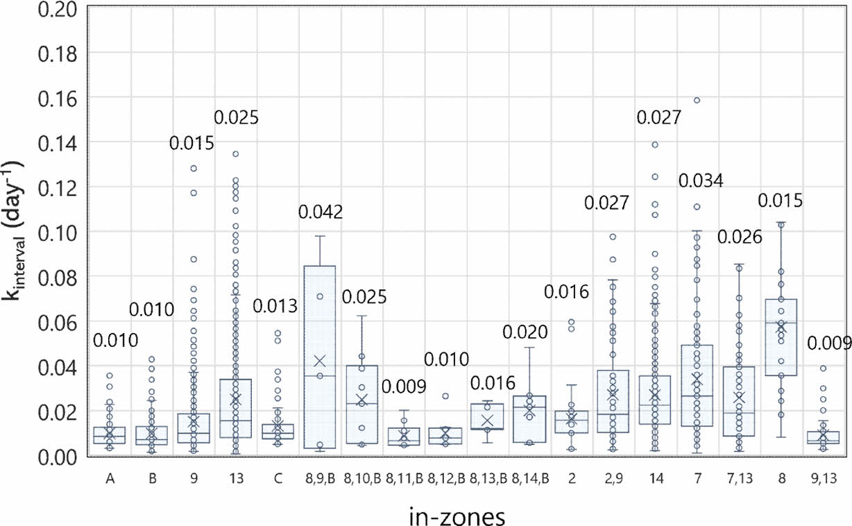 Fig. 18 Correlation of initial TPH concentration and kinterval according to in-zones. |