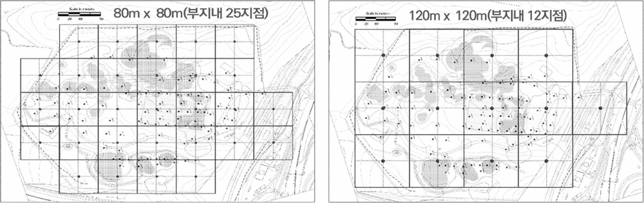 식 (2)과 식 (3)에 의한 조사 지점수는 9.2개, power curve(cv)에 의한 조사 지점수는 4~61개의 범위로 산정되었다. 한편, 사각격자(80 m × 80 m)에 의한 시료 채취 지점을 확인한 결과 부지의 정화완료 확인을 위한 최소 조사 지점수는 15지점이였다(Fig. 6). 최종적으로 지표면의 사면부 및 지장물 등으로 계획 좌표에서 시료 채취가 불가능한 경우를 고려하여 조사 지점수는 총 90개로 결정하였다. 조사는 표층에서 암반까지 1 m 간격으로 TPH 90지점(시료 552점), xylene 25지점(시료 267점)에서 수행되었다.