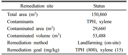 오염토양의 정화는 부지 내(on-site)에서 실시되었으며, 정화 대상물질은 xylene 및 Total petroleum Hydrocarbon (이하 TPH)의 2종이였다. 오염토양의 정화는 전량 토양경작법으로 수행되었으며, 정화목표는 2지역 우려기준1)이 적용되었다. 본 부지의 오염토 및 정화 개요는 Table 1과 같다.