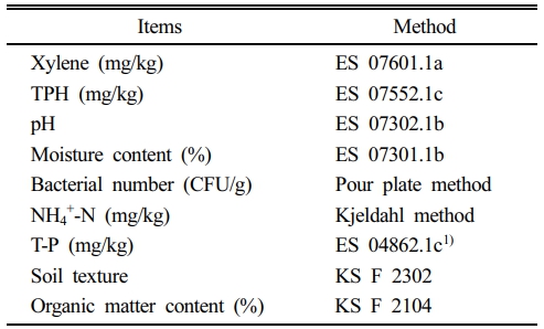 본 부지의 오염토 정화를 위하여 5개 경작동(house)이 운영되었으며, 오염물질별 경작동 운영은 xylene 5회(2021년 3월~5월), TPH 57회(2021년 1월~2022년 8월)가 실시되었다. 부지 내 오염 구역에서 굴착된 오염토양은 현장 상황에 따라 일정 기간 보관된 후 경작장으로 투입되거나 굴착 후 바로 투입되었다. 미생물제 및 영양소의 투입2)은 운전 시작 전에 오염토양의 특성(pH, 함수율, 미생물 수, 암모니아성질소, 총인, 토성)을 분석하여 결정하였다. 경작을 위한 경운 및 수분공급은 주 1~2회 이루어졌으며, 경작 과정의 오염물질 농도 확인은 각 경작동에 설치된 8개 방형구(cell)에서 7~10일 간격으로 수행되었다. 오염물질 농도 분석은 xylene는 총 30회, TPH는 총 2,316회 실시되었다. 토양시료의 분석 방법은 Table 2와 같다.