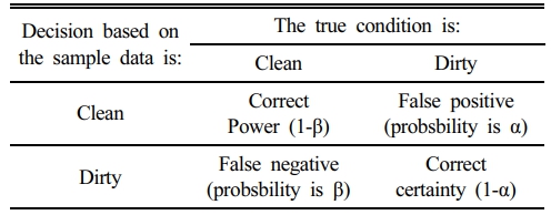 조사 지점수를 산정하기 위해서는 통계적으로 유의미한 신뢰수준과 불확실성을 결정해야 한다. 분석값에 의한 판정은 실제 상태에 대한 신뢰수준의 범위에서의 불확실성 통계이므로 먼저 신뢰수준, 위양성율(a), 위음성율(b)를 결정하고 조사 지점수를 산정한다(Table 5).