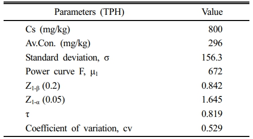 Xylene은 되메움 평균농도가 0.1 mg/kg(5개)으로 동일하였으므로, 조사지점수는 TPH의 되메움 평균농도 56개로 산정하였다. TPH의 함수값은 Table 6과 같다.