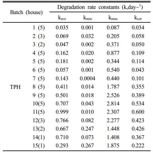 이상의 TPH 정화품질관리에 사용된 분해속도상수는 Table 8과 같다.