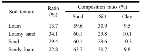 경작장으로 반입된 오염토는 양토(loam), 양질사토(loamy sand), 사토(sand), 사양토(sandy loam)로 주로 통기성이 좋은 모래질 성분으로 구성되었다(Table 9). 반입 오염토의 토성이 경작 효율에 미치는 영향을 확인하기 위하여 토성(soil texture)과 TPH 구간 분해속도상수의 상관관계를 분석하였다(Fig. 13). 구간 분해속도상수는 양질사토(loamy sand), 사토(sand), 사양토(sandy loam), 양토(loam)의 순이였으나, 유의미한 상관관계는 보이지 않았다.