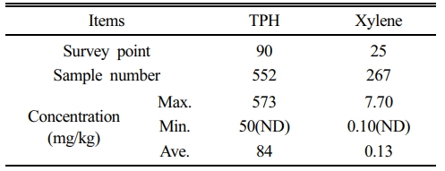 본 부지의 정화완료 평가를 위하여 채취된 시료의 TPH 및 xylene 분석결과는 Table 12와 같다.